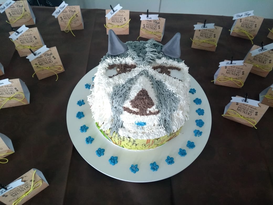 E o nosso era assim: um lindo e delicioso bolo confeitado em formato de lobo! As crianças não continham a admiração!