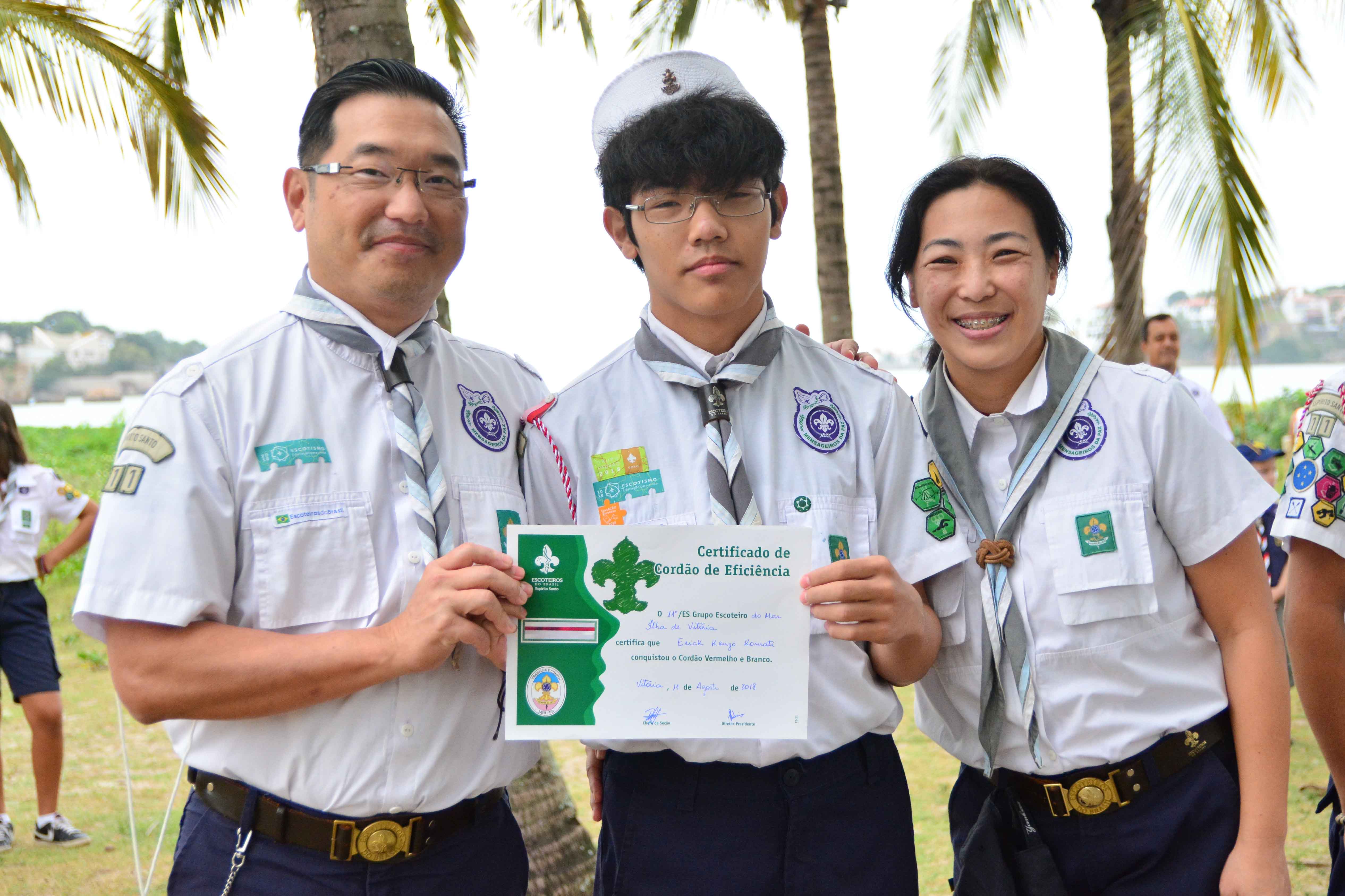 Teve também certificado de Eficiência! Erick Kenzo pode receber seu cordão vermelho e branco, resultado de uma trajetória de engajamento na atividade escoteira! Seus pais, os chefes Frank e Marcia e sua irmã Lais estavam radiantes com a conquista.