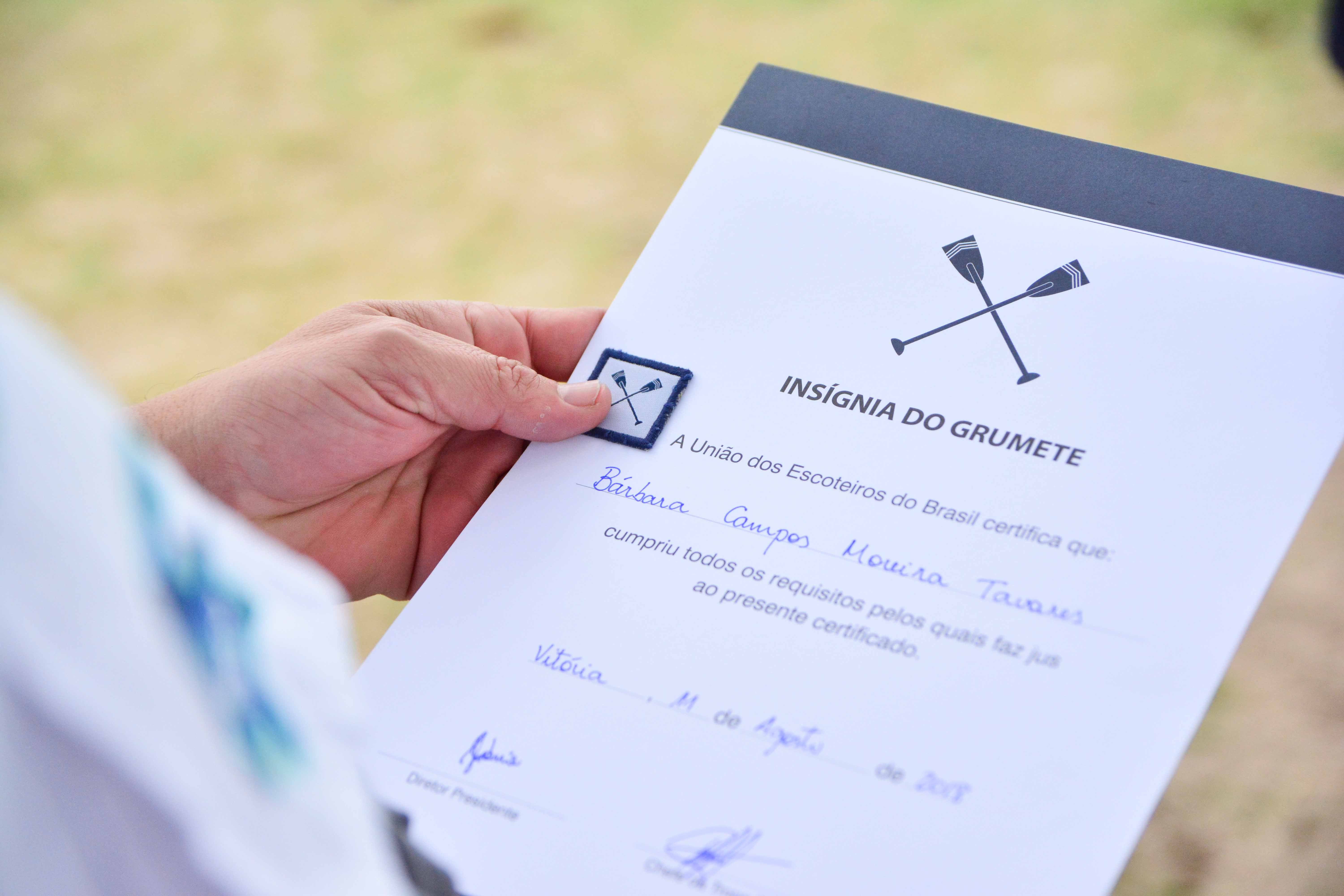Na Tropa Escoteira teve entrega de distintivo também – a Insígnia de Grumete, uma especialidade da Modalidade do Mar. Ela é concedida àqueles que possuírem três especialidades relativas a Modalidade do Mar, em nível 2. Com muito empenho, disciplina e persistência, cinco escoteiras cumpriram todos os requisitos e receberam das mãos do Chefe da Tropa Escoteira Épsilon, Richardson Murta, a tão almejada insígnia. As jovens demonstraram o crescimento e comprometimento que alcançaram ao longo de suas trajetórias no movimento escoteiro, motivo de orgulho e alegria para seus chefes de patrulhas.