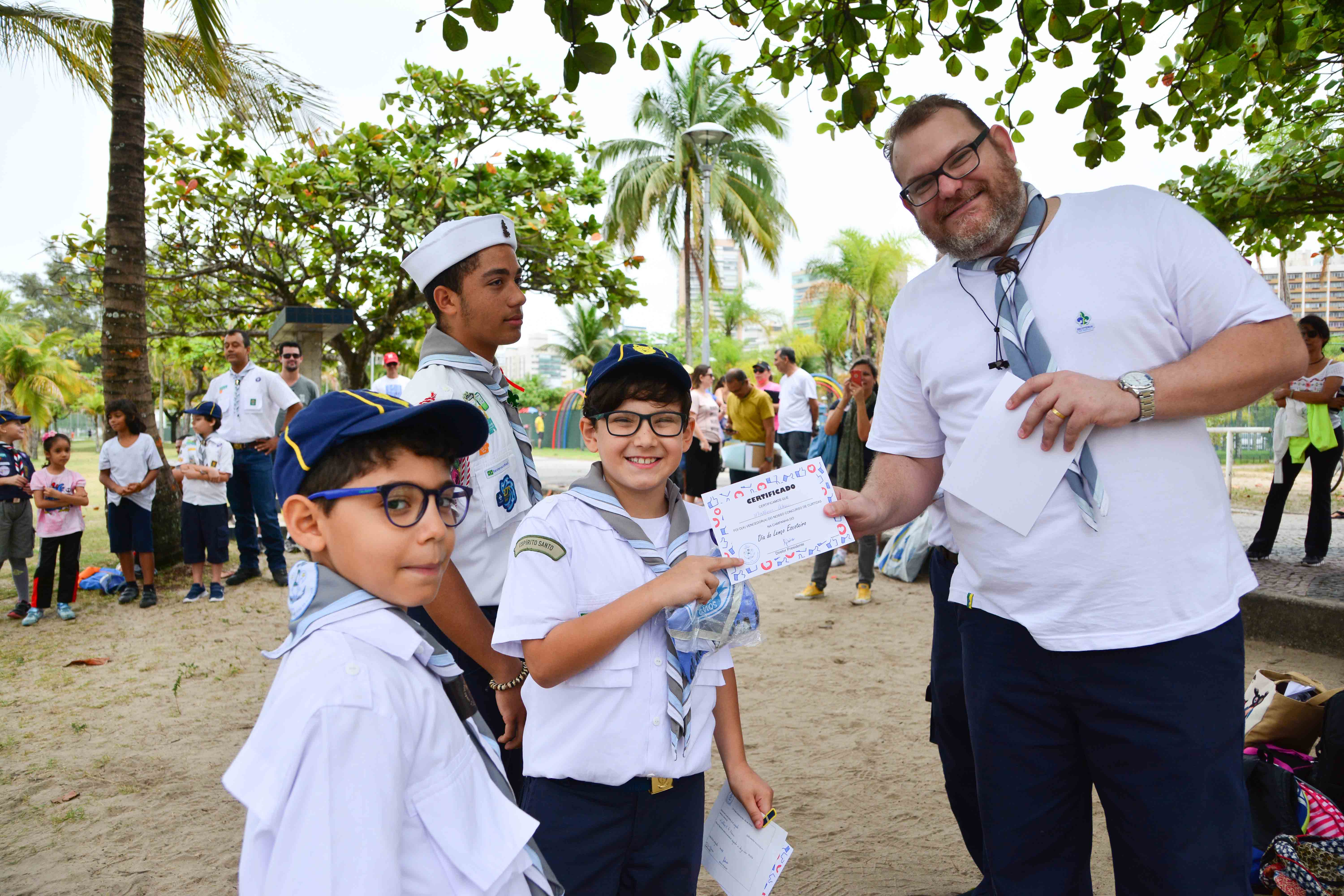 Ao final das atividades era a hora da entrega da premiação do Concurso de Curtidas lançada em comemoração ao Dia do Lenço Escoteiro. O desafio era postar uma foto usando o lenço escoteiro, no trabalho, escola… e quem conseguisse receber mais curtidas iria receber um lenço comemorativo do nosso Grupo Ilha de Vitória.