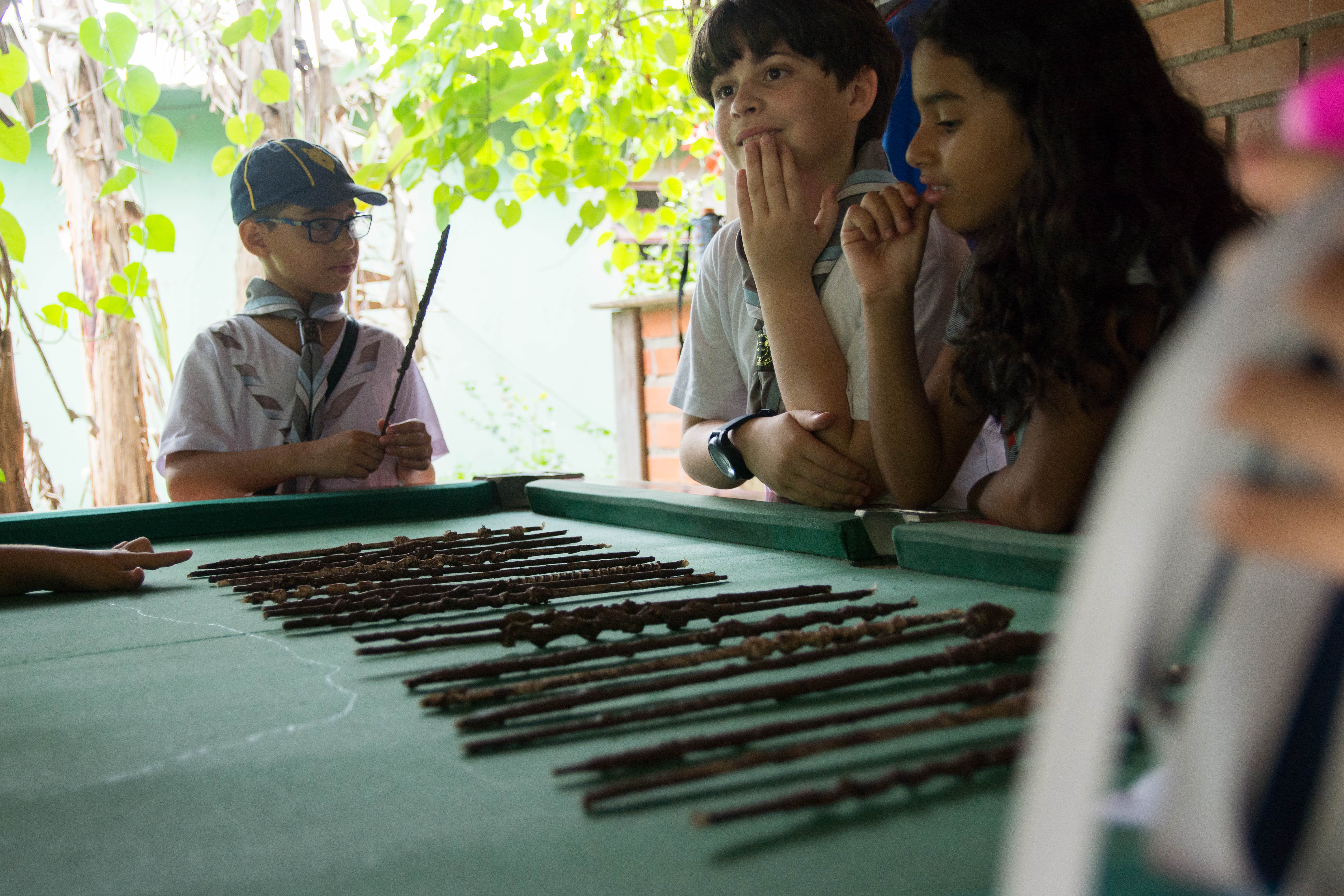 Esse ramo iniciou a manhã realizando atividades de base, todas criadas de maneira a adaptar jogos a magias ou competições narrados nos livros. Entre elas havia bases de “levitação”, onde o lobinho precisava equilibrar uma pena, sem deixar o vento atrapalhar… Ou então, reconstruir o escudo da sua Casa, que fora “partido por magia”. Todas as atividades, lúdicas e educativas, primavam por trazer experiencias práticas num contexto encantado pelas descrições do livro.