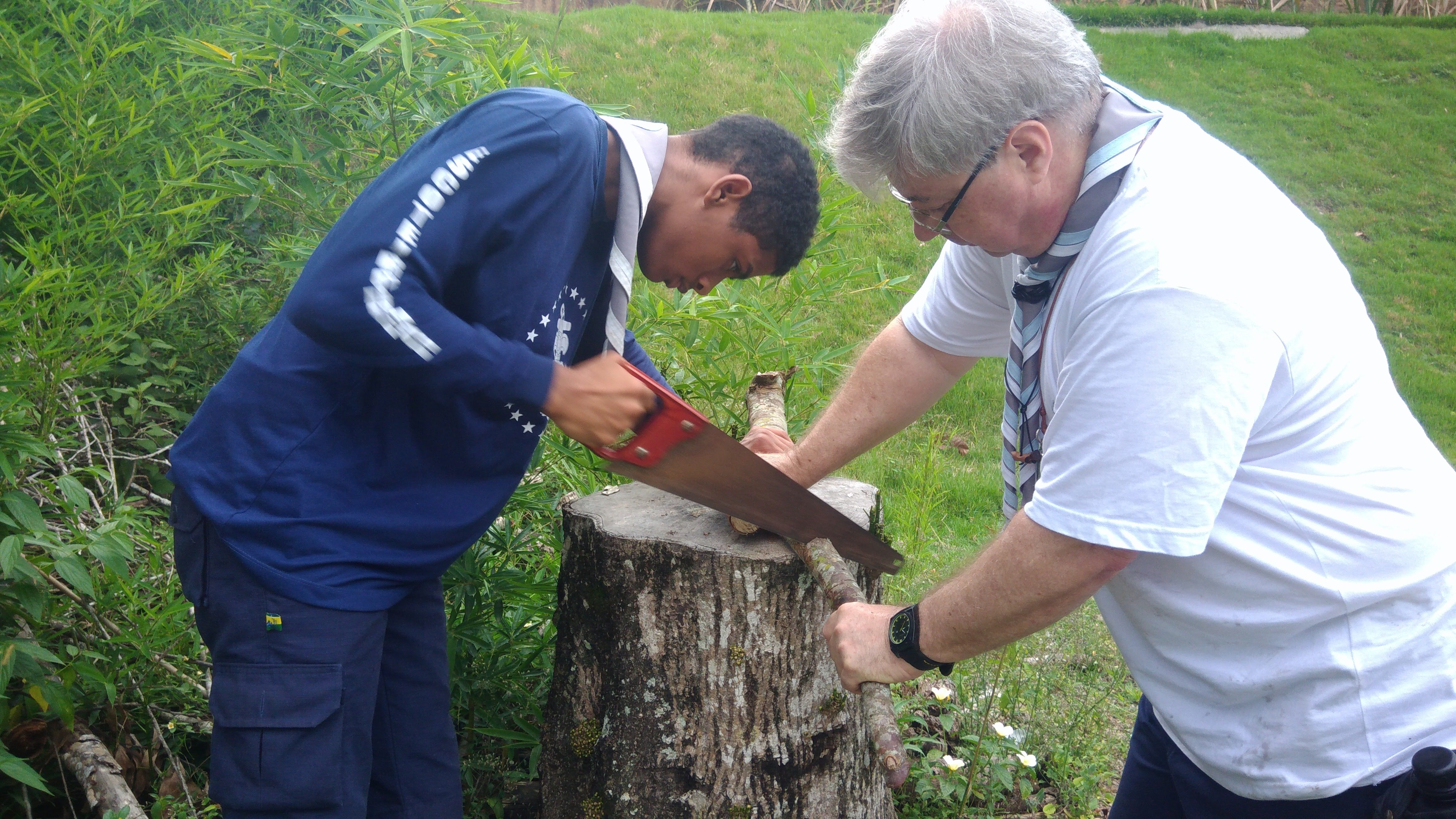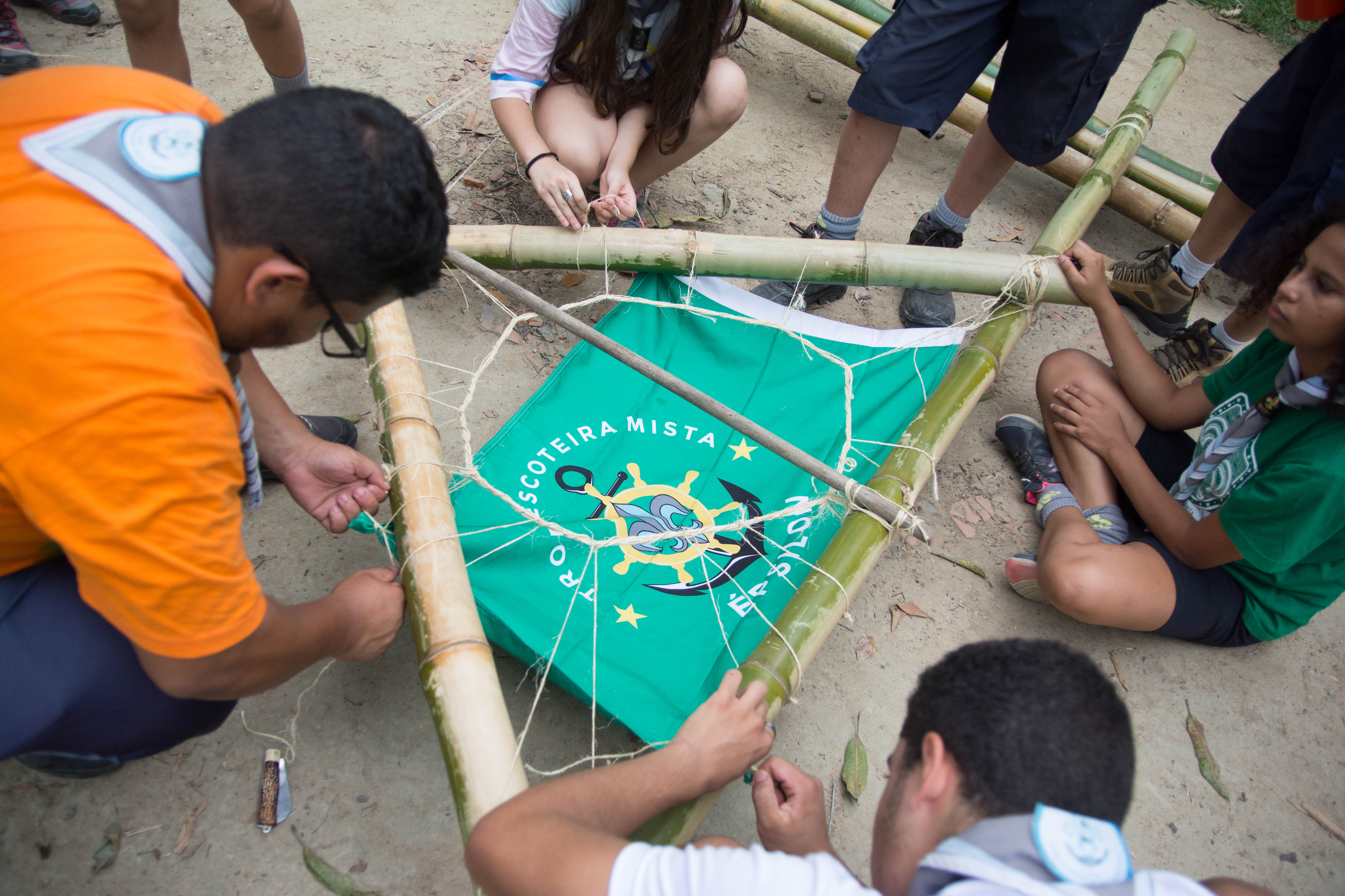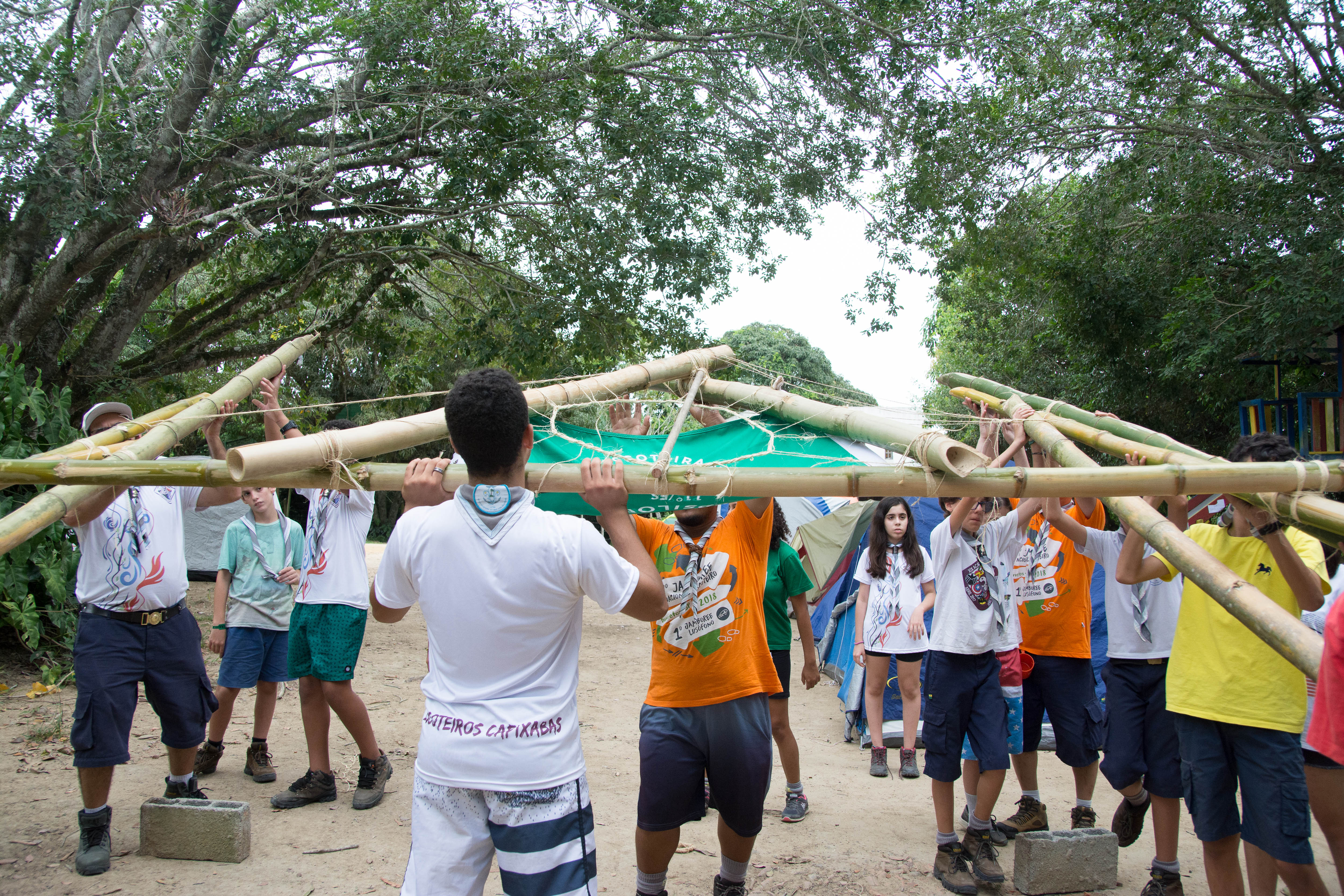 Para os escoteiros, as atividades iniciaram com a construção de um portal em pioneiria para demarcar a área do acampamento e hastear a bandeira da tropa. Muito bambu, técnicas de nós e amarras e esforço e pronto! Eles conseguiram erguer! Prova de um trabalho de equipe bem planejado e executado!