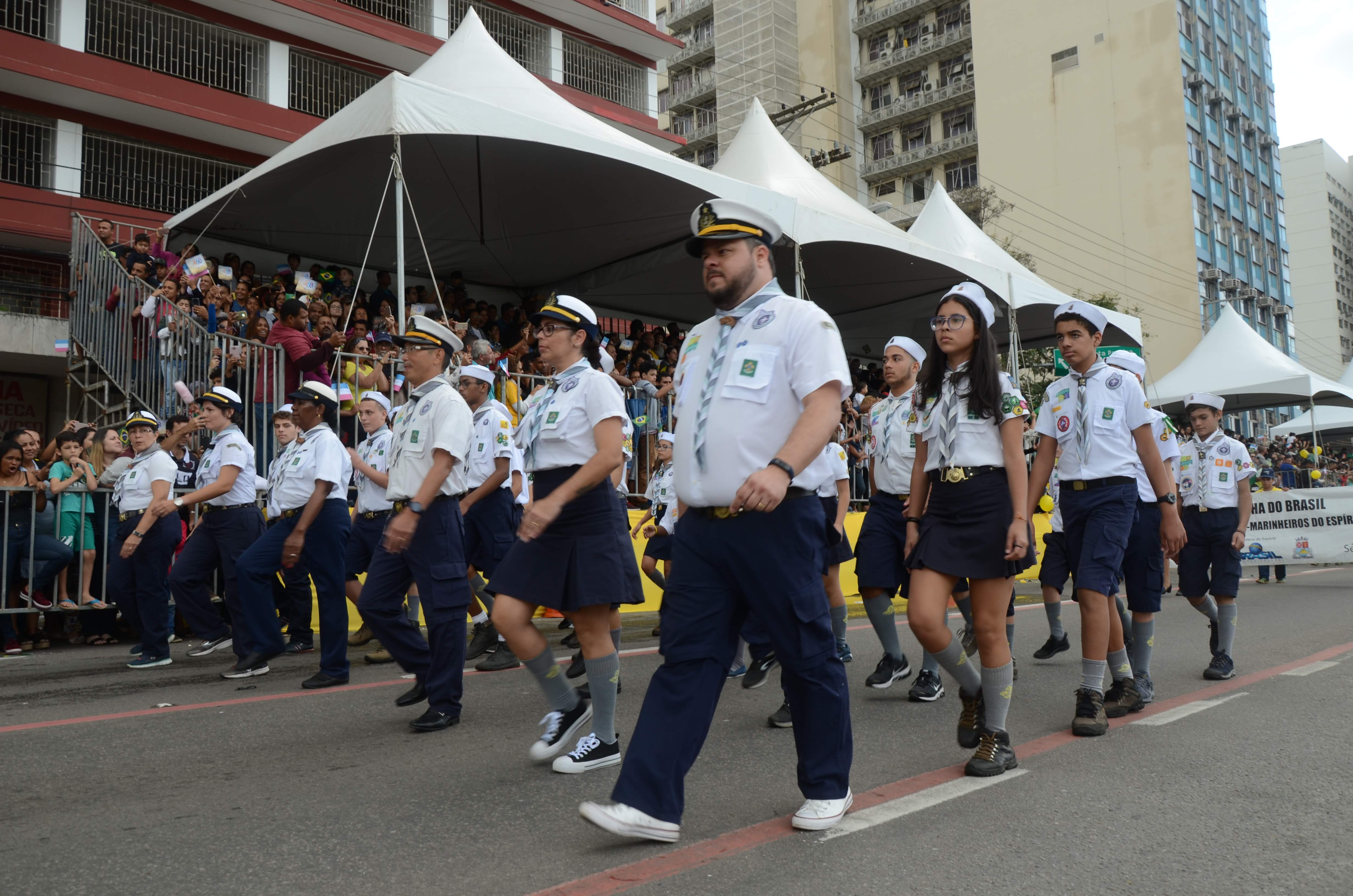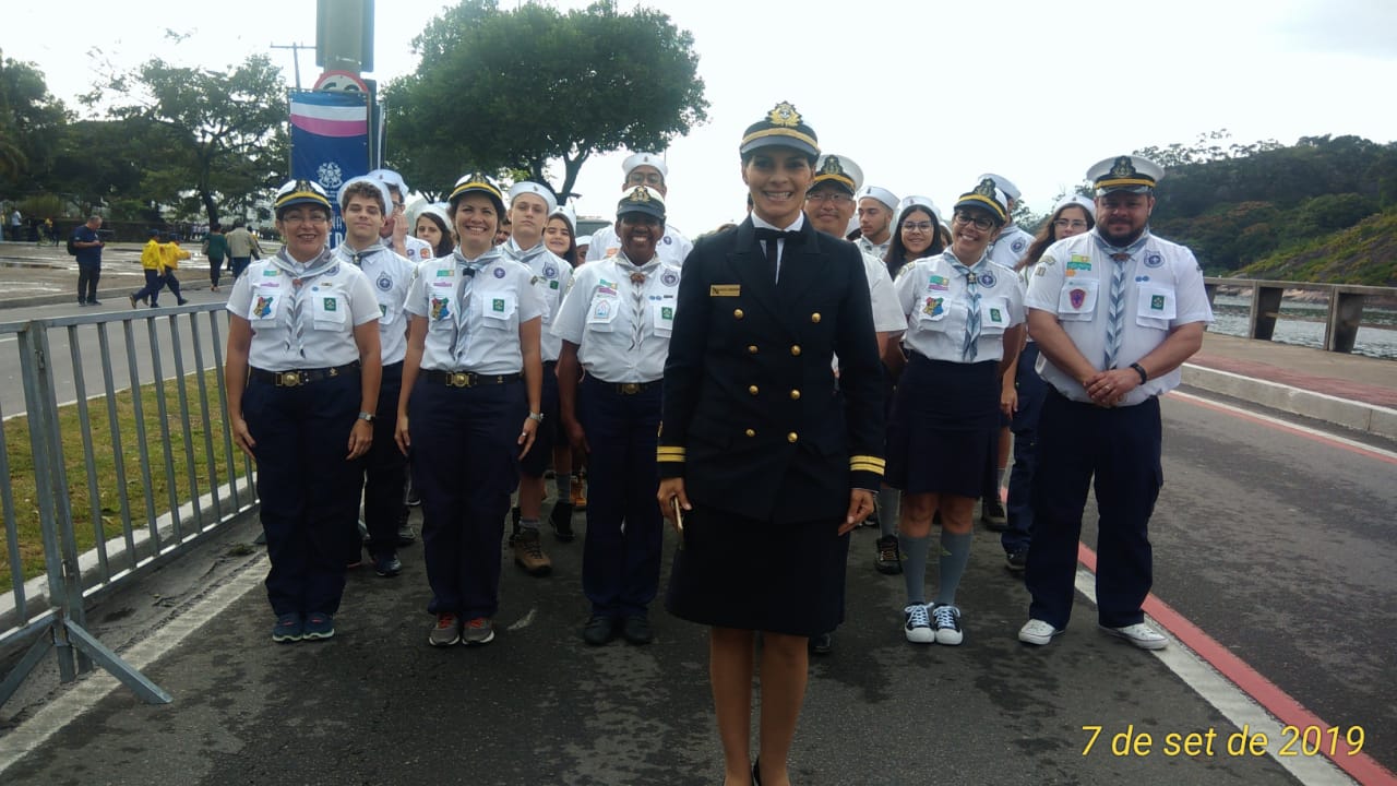 A grande surpresa foi a oportunidade de desfilar também junto à Marinha do Brasil! Por sermos escoteiros do mar e estarmos realizando nossas atividades na Capitania dos Portos do Espírito Santo, fomos convidados a compor o contingente da Marinha destacado para essa atividade.