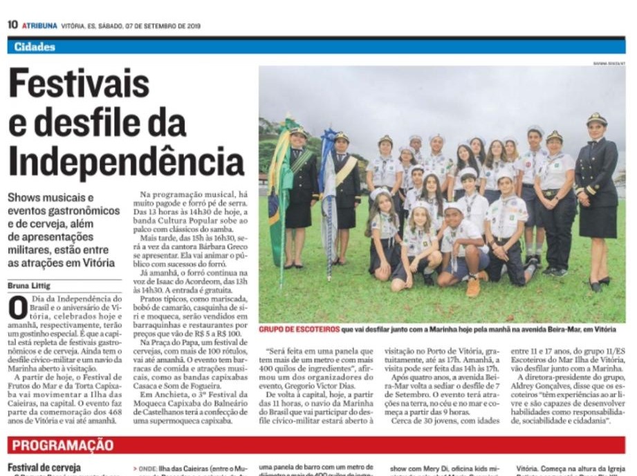 Nossa emoção não parou por aí! Nesse mesmo dia, tivemos a nossa participação no desfile citada e a respectiva foto publicada no jornal A Tribuna, em sua versão impressa, na página 10. Além de divulgarmos ainda mais o Movimento Escoteiro e nossa modalidade, ainda garantimos mais 50 pontos para Certificação do Grupo Padrão. Yes!!