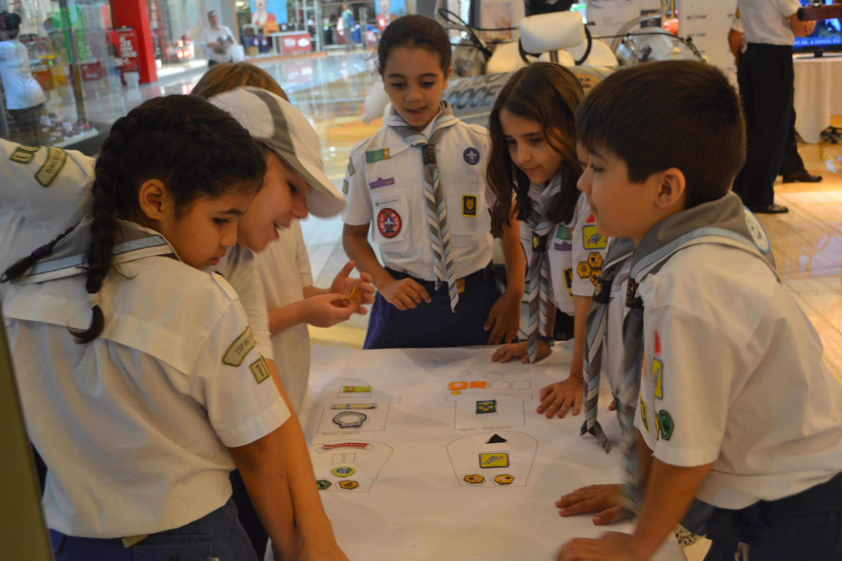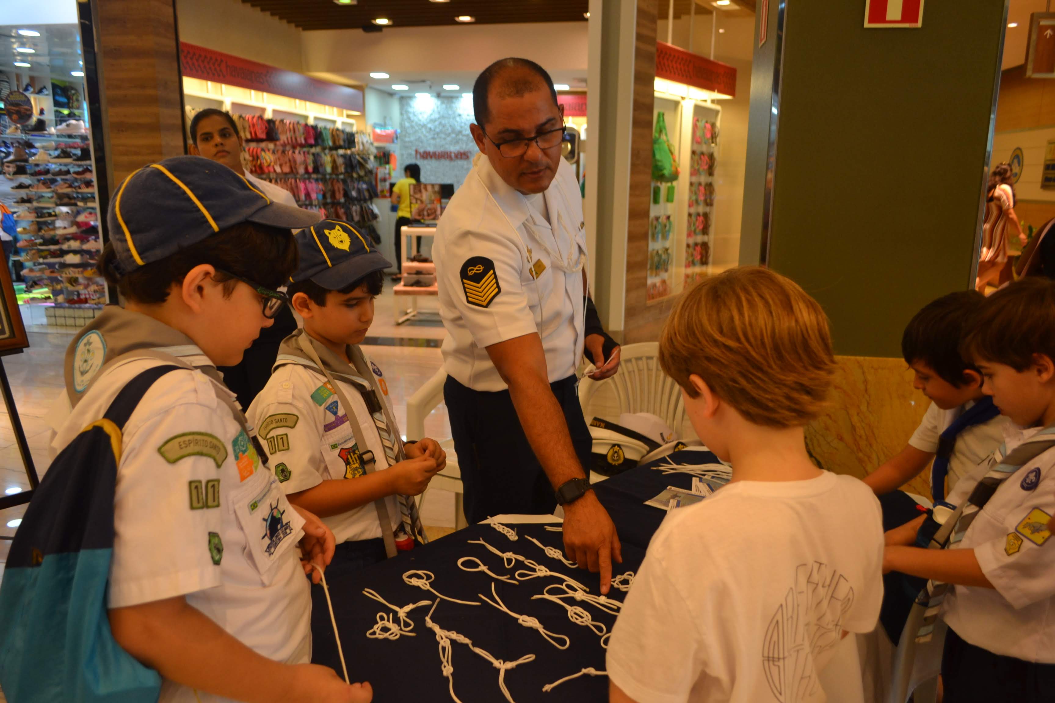 Além dessa faina, as crianças realizaram atividades escoteiras adaptadas ao estacionamento coberto do shopping. O ramo lobinho viveu “um dia de marinheiro”, participando de atividades criadas especialmente pelos nossos criativos chefes. Também puderam participar da oficina de nós promovida pela Marinha e foram elogiados pelos militares, pelo empenho e habilidade em reproduzir cada um deles.