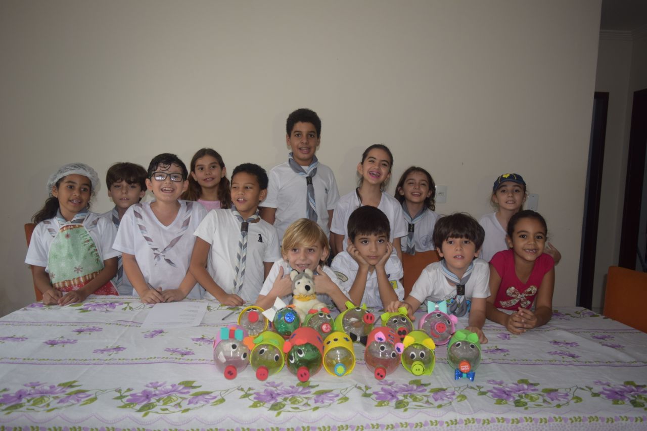 Na mesma tarde eles confeccionaram também cofrinhos, trabalhando em grupo de modo que os lobinhos mais velhos auxiliavam os menores, e o trabalho em equipe acontecia naturalmente. Os pais ficaram de apoio e nesta atividade foi possível cumprir itens para a especialidade Artesanato, trabalhar o desenvolvimento das habilidades psicomotoras, de convívio social e ainda ensinar noções de planejamento financeiro, já que os cofrinhos vão ser utilizados para os lobinhos guardarem suas economias para a viagem que farão no segundo semestre deste ano.
