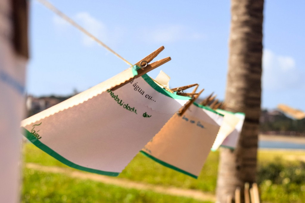 Na primeira atividade do MutEco foi entregue para cada integrante dos grupos um cartão com uma frase incompleta sobre o tema. O grupo deveria refletir e completar a frase. Os cartões seriam expostos em um varal para que, no final, fossem escolhidas algumas frases e discutidas em grupo.