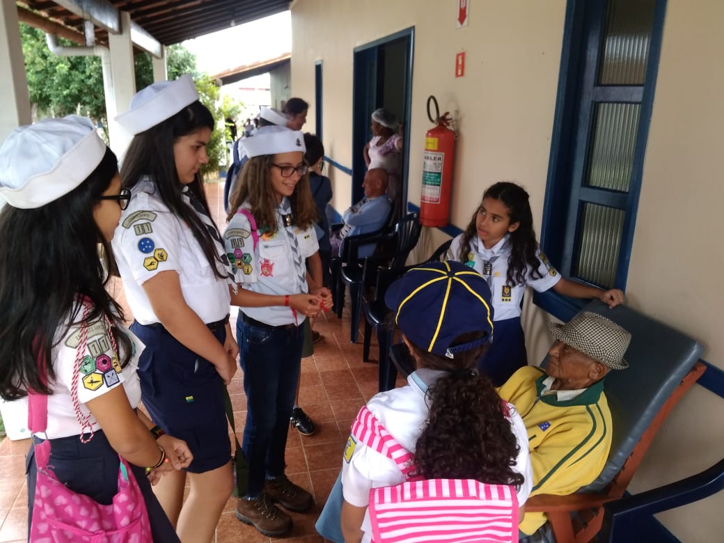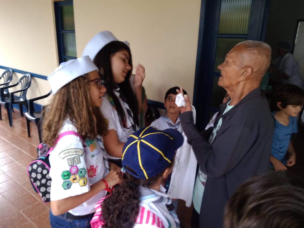 No entanto, os idosos também querem aprender e ouvir estórias. Curiosos, se mostraram interessados em conhecer o 11º/ES Grupo Escoteiro do Mar Ilha de Vitória, o que é o escotismo e o que fazemos. Entre eles, havia um senhor que, quando jovem fez parte do movimento escoteiro ( mas como já sabemos, “uma vez escoteiro, sempre escoteiro!”).